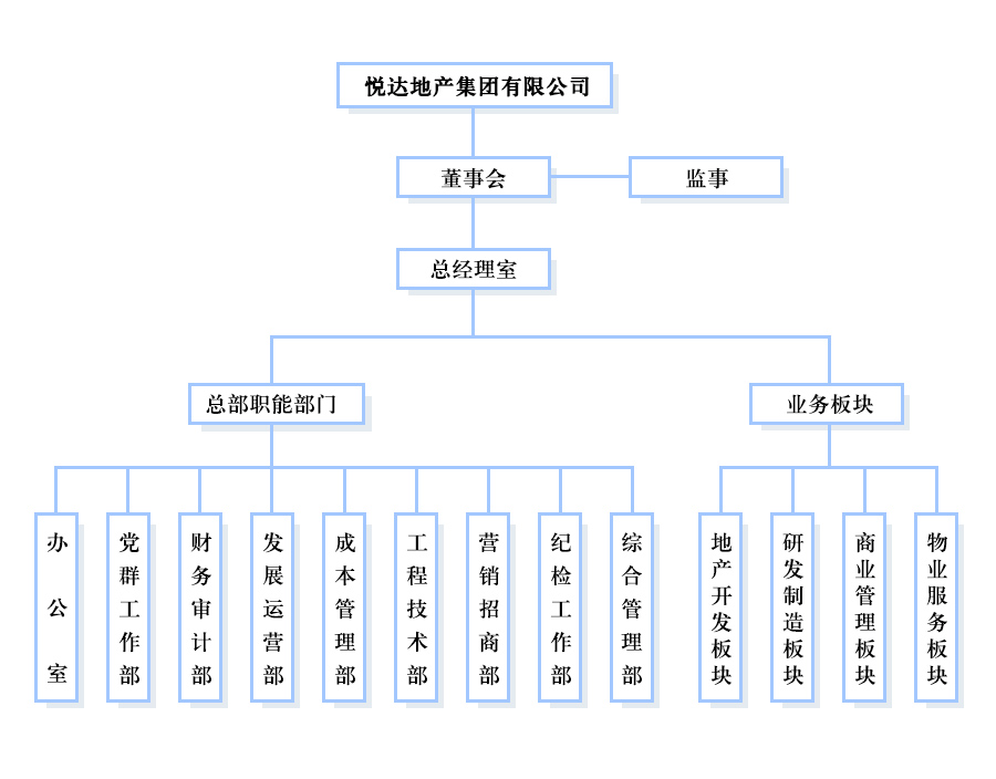 悅達地產(chǎn)實行董事會領(lǐng)導下的總經(jīng)理負責制,業(yè)態(tài)涵蓋房地產(chǎn)開發(fā)、商業(yè)管理、物業(yè)服務、研發(fā)制造等領(lǐng)域。擁有鹽城悅達置業(yè)發(fā)展有限公司、上海悅達房地產(chǎn)發(fā)展有限公司、江蘇悅達商業(yè)地產(chǎn)有限公司、江蘇悅達綠色建筑科技有限公司、悅達地產(chǎn)服務江蘇有限公司、悅達地產(chǎn)(東臺)有限公司、上海悅致房地產(chǎn)發(fā)展有限公司等多家全資公司以及上海悅達新世紀發(fā)展有限公司、上海悅達悅享商業(yè)管理有限公司、江蘇萬科悅達實業(yè)有限公司、江蘇綠陽置業(yè)有限公司、西安悅達悅睿置業(yè)有限公司、悅達華美西安置業(yè)有限公司、常熟華坤房地產(chǎn)開發(fā)有限公司、淮安市新璀璨房地產(chǎn)有限公司、鹽城悅達天惠置業(yè)有限公司等數(shù)十家合資公司。