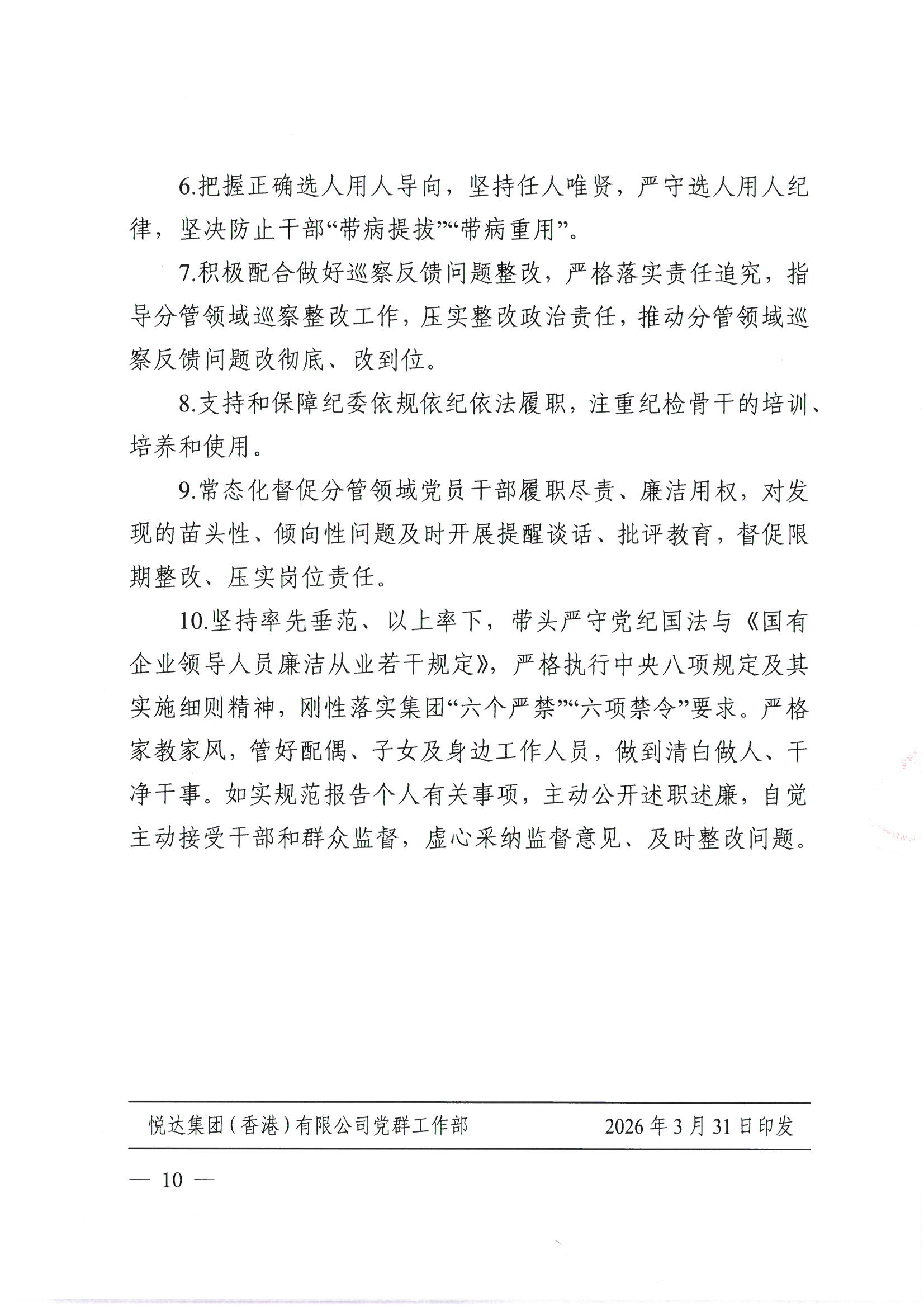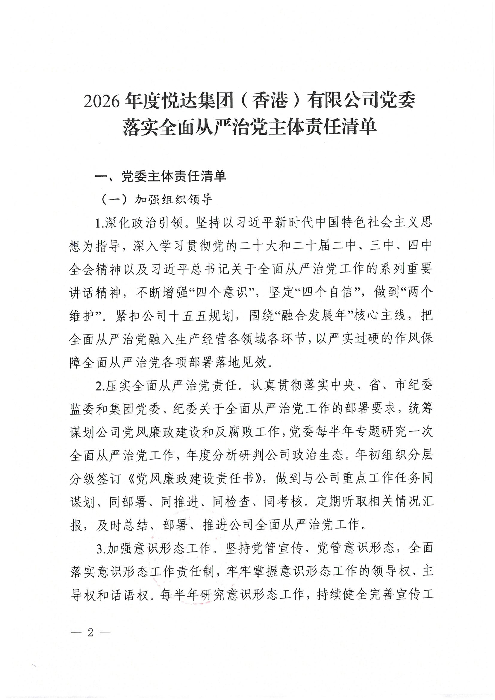 2026年度悅達(dá)集團(tuán)(香港)有限公司黨委落實(shí)全面從嚴(yán)治黨主體責(zé)任清單